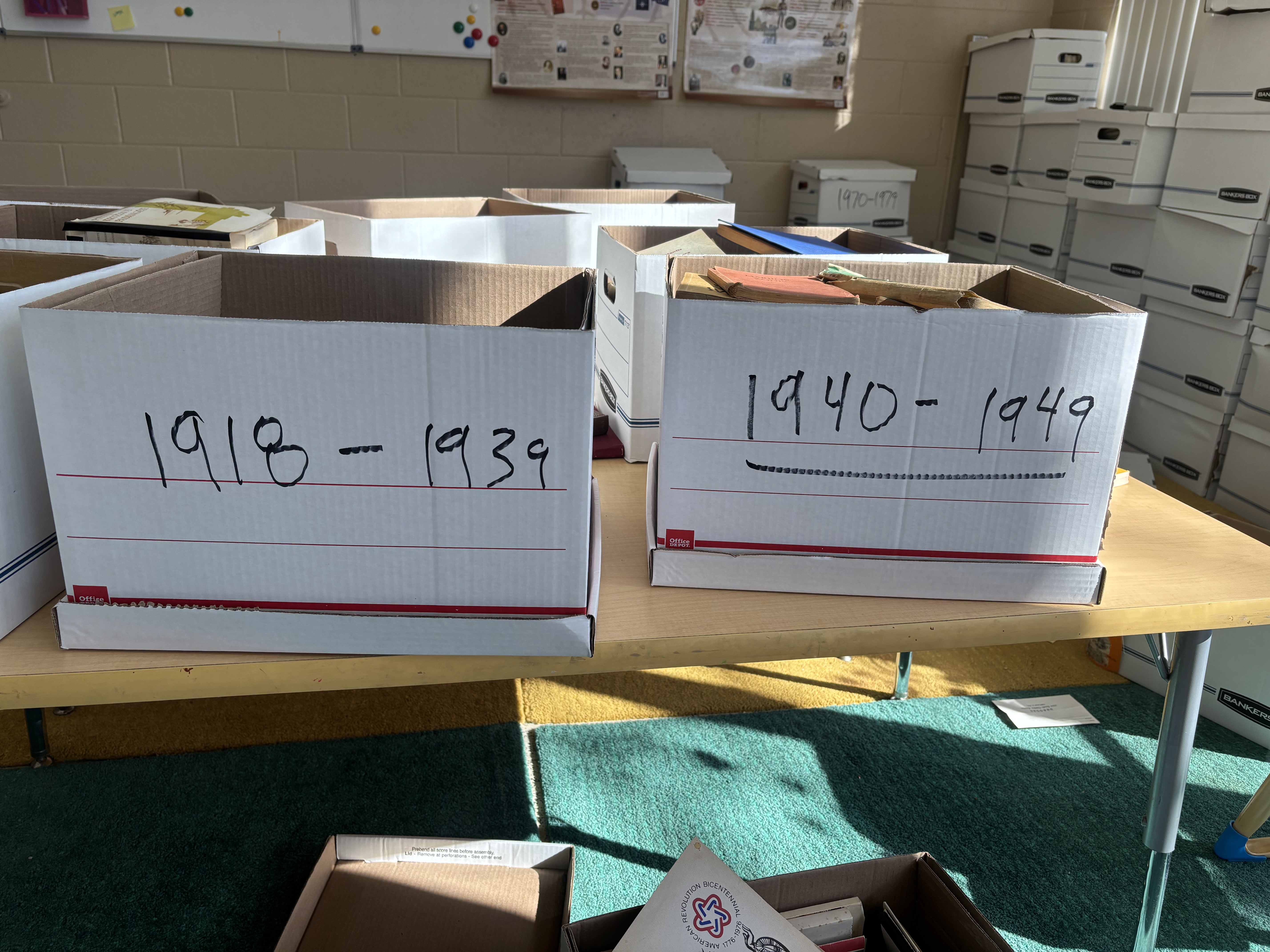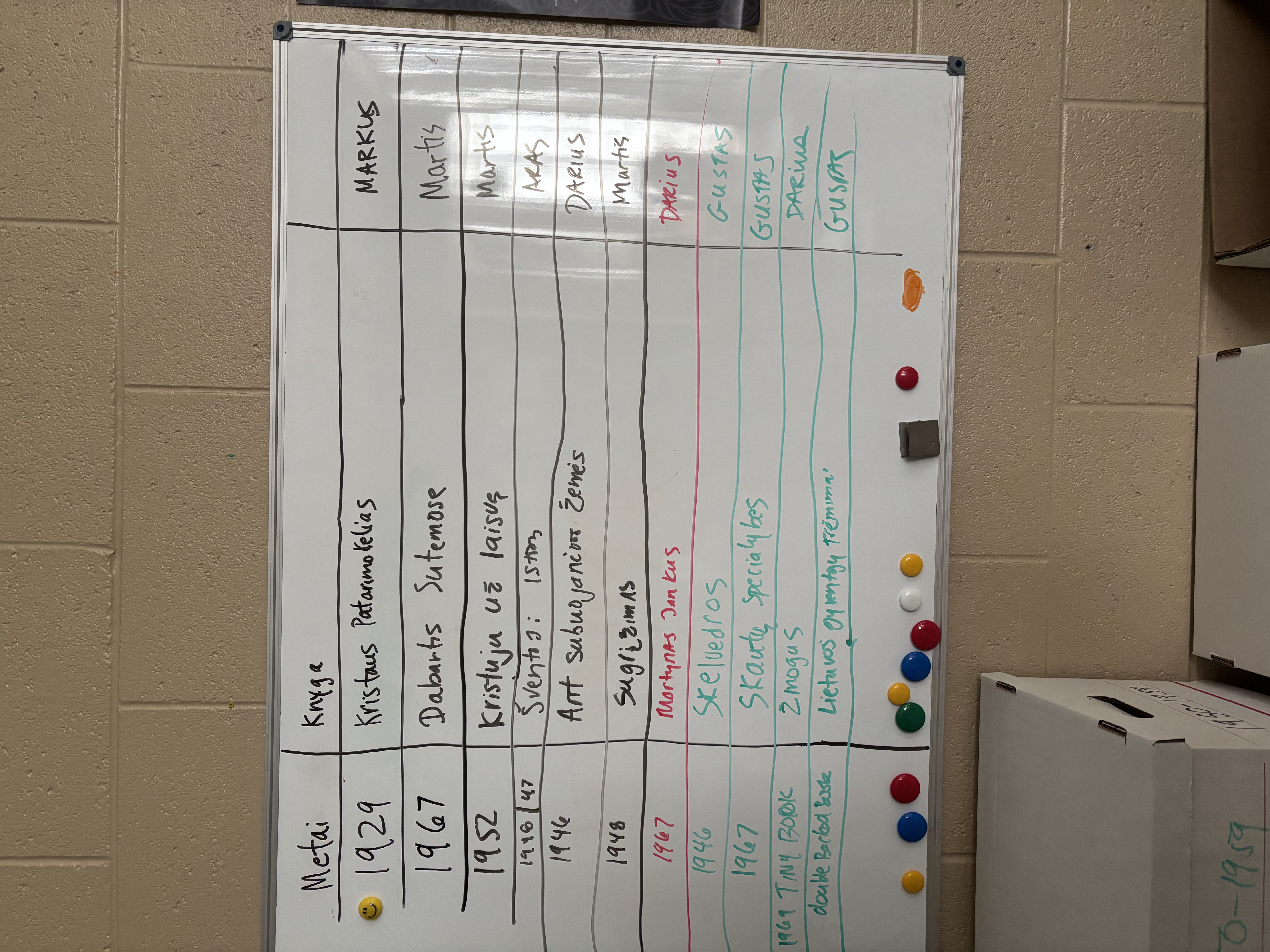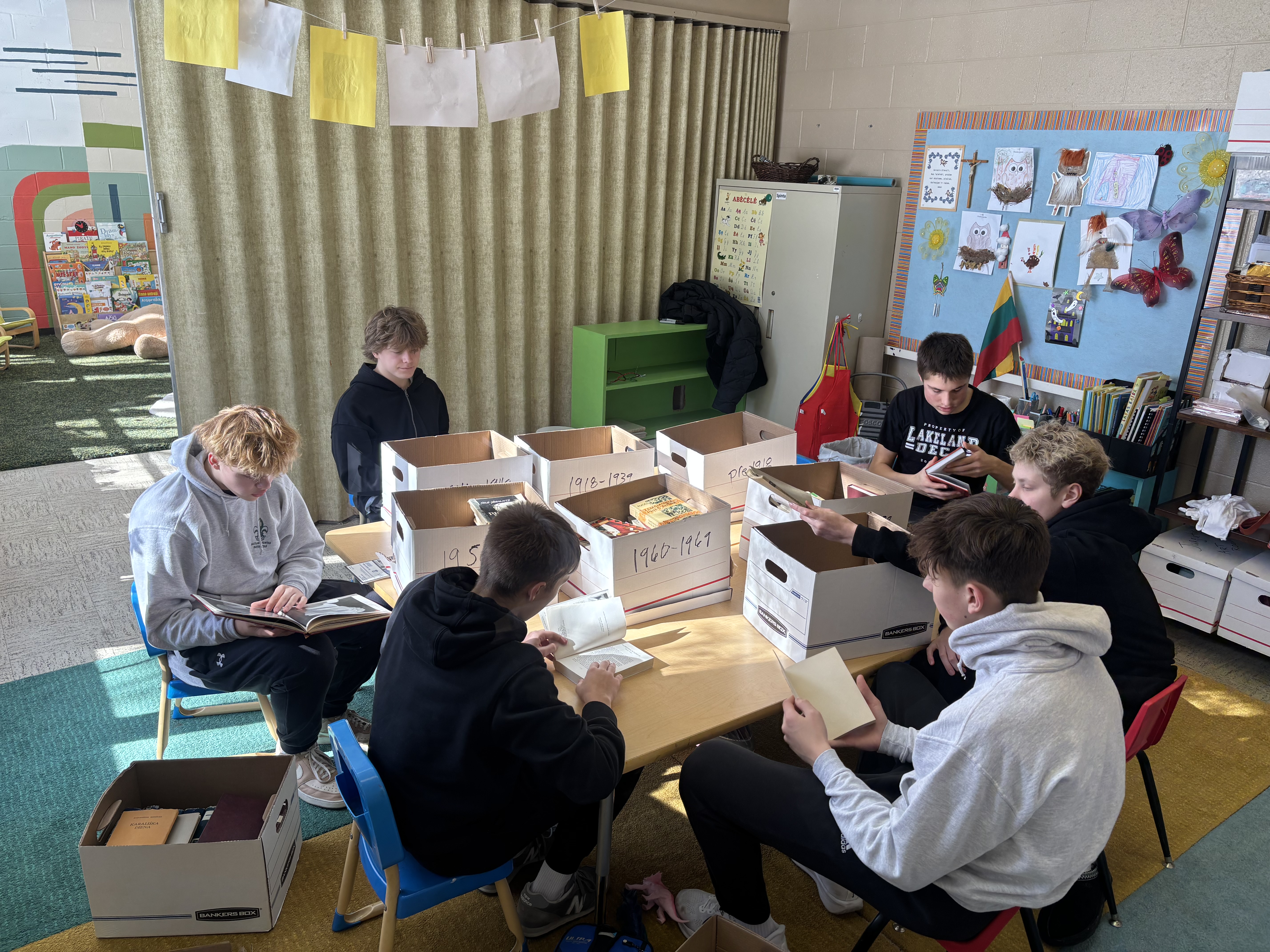 Students in the Skaitmeniniai Knygnešiai internship begin this work directly with the physical collection. Books are removed from storage containers and sorted by approximate historical period, mapped to six waves of Lithuanian emigration. This establishes the first chronological structure across the collection and creates the conditions for systematic cataloging.